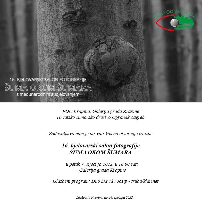 Izložba 16. Bjelovarski salon fotografije - Šuma okom šumara, s međunarodnim sudjelovanjem, otvara se 7. siječnja 2022. u Galeriji grada Krapine uz glazbeni program u izvedbi Dua David i Josip (truba/klarinet). Izloženi radovi moći će se pogledati do 24. siječnja 2022.