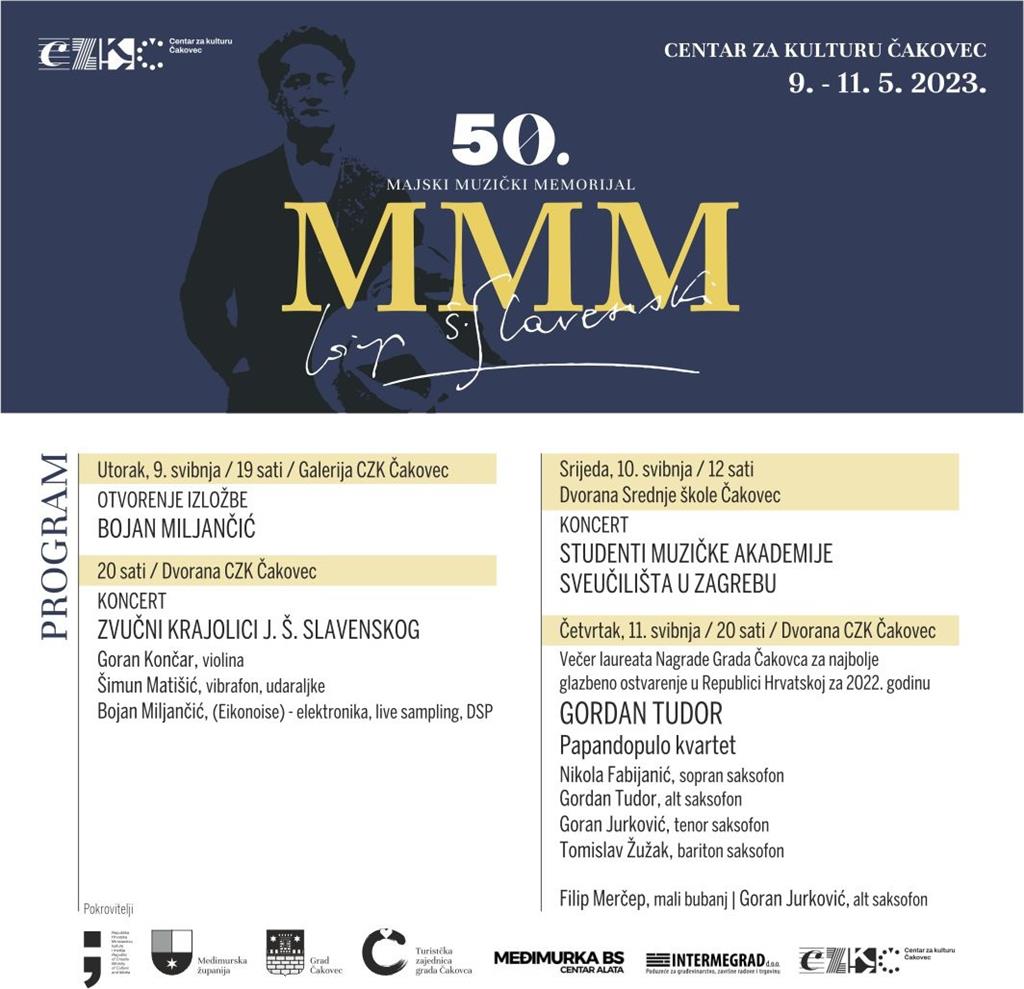 Memorijal započinje u petak 9. svibnja u CZK Čakovec otvorenjem izložbe Bojana Miljančića, a nakon otvorenja, autor će na velikoj pozornici izvesti zvučno – glazbeni performans u suradnji s Goranom Končarom i Šimunom Matišićem pod nazivom “Zvučni krajolici J. Š. Slavenskog”.