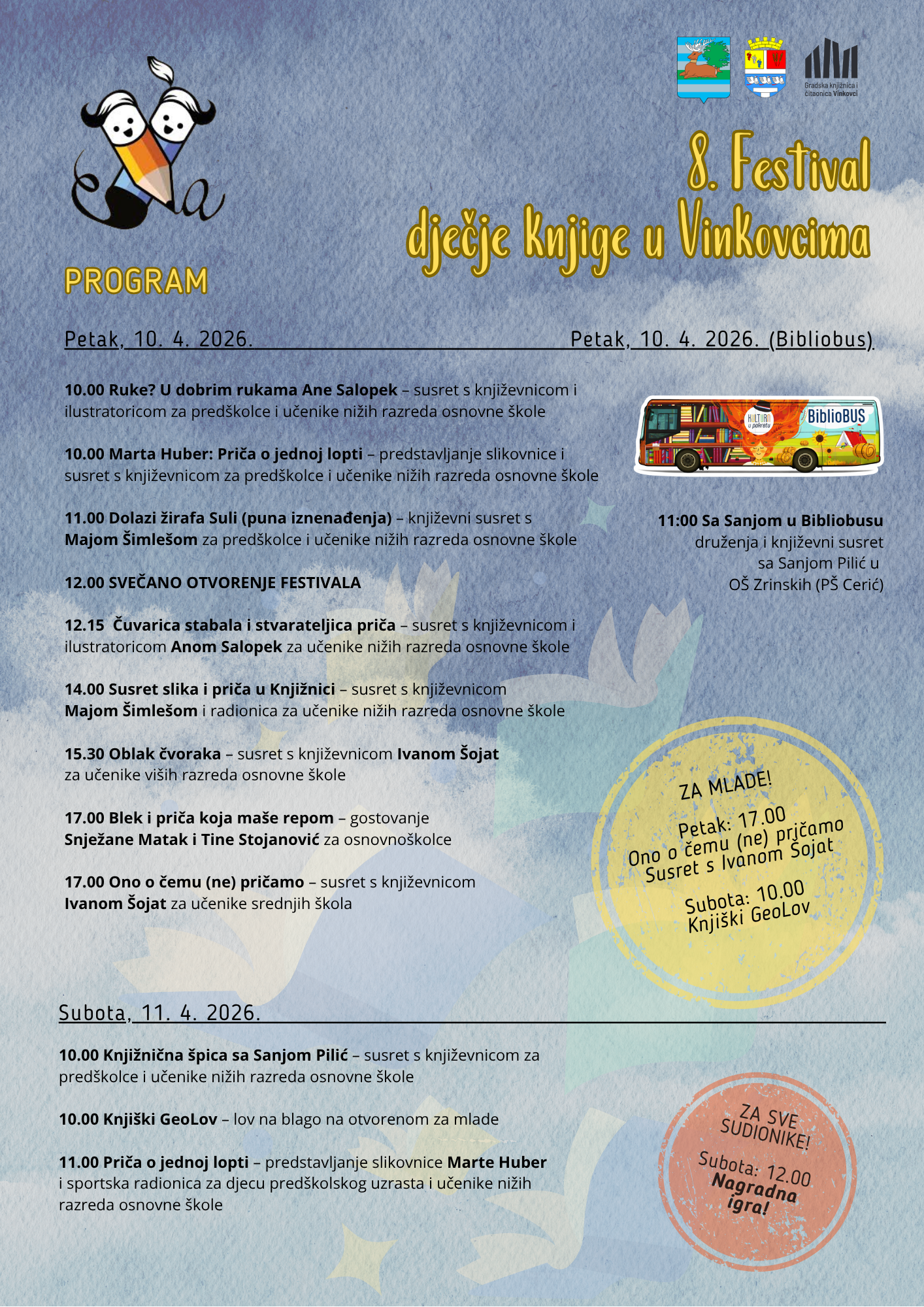 Osmo izdanje Festivala dječje knjige u Vinkovcima održava se 10. i 11. travnja u Gradskoj knjižnici i čitaonici Vinkovci.