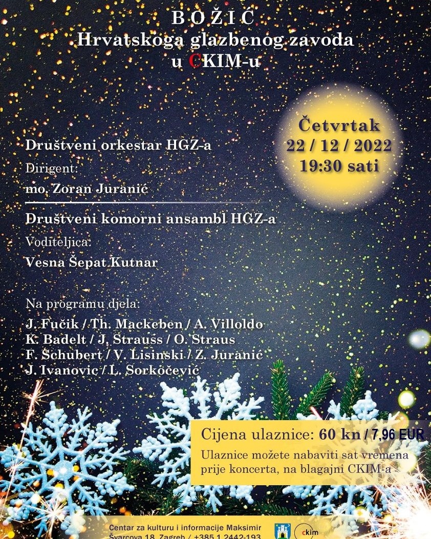 Društveni orkestar Hrvatskog glazbenog zavoda i Društveni komorni ansambl HGZ-a te Centar za kulturu i informacije Maksimir pozivaju na božićni koncert koji će se održati u velikoj dvorani CKIM-a u Zagrebu, Švarcova 18, u četvrtak, 22. prosinca u 19.30 sati.