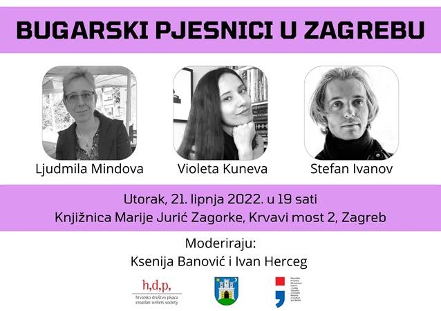 Nagrađivani bugarski pjesnici Ljudmila Mindova, Violeta Kuneva i Stefan Ivanov nastupit će na književnoj večeri u Knjižnici Marije Jurić Zagorke na Krvavom mostu, u utorak, 21. lipnja 2022. u 19 sati.