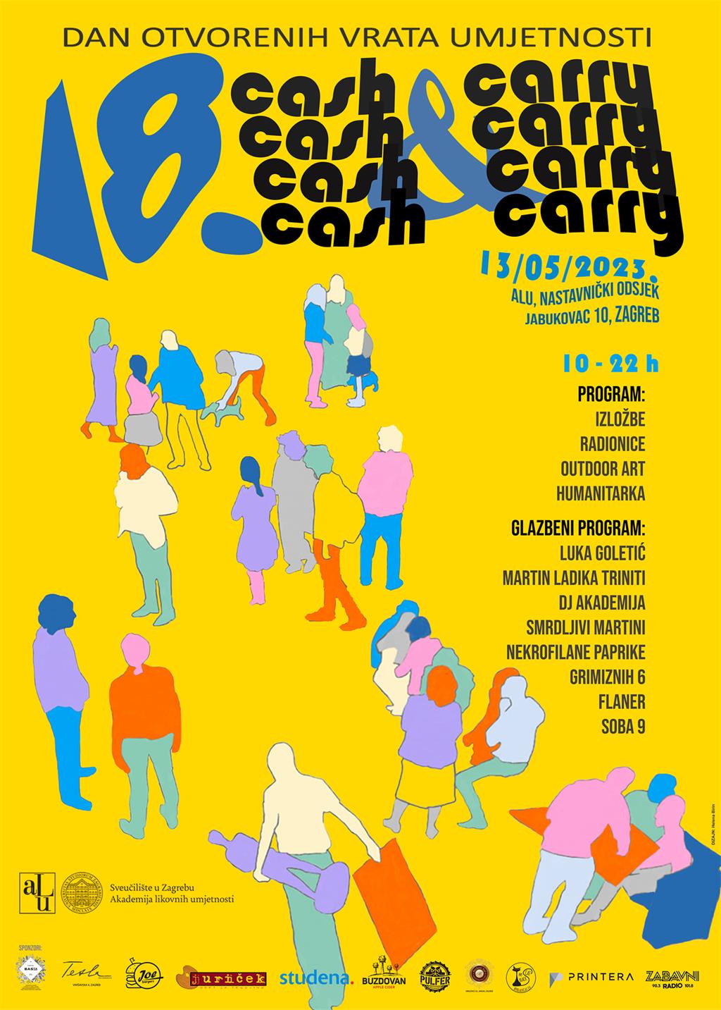 I ove akademske godine ALU nastavlja s dugogodišnjom tradicijom održavanja manifestacije „Cash&Carry - Dan otvorenih vrata umjetnosti". Projekt vode studenti treće godine preddiplomskog studija Nastavničkog odsjeka Akademije likovnih umjetnosti, uz potporu profesora. U subotu 13. svibnja od 10 do 22 sata, na Jabukovcu! Ulaz je besplatan.