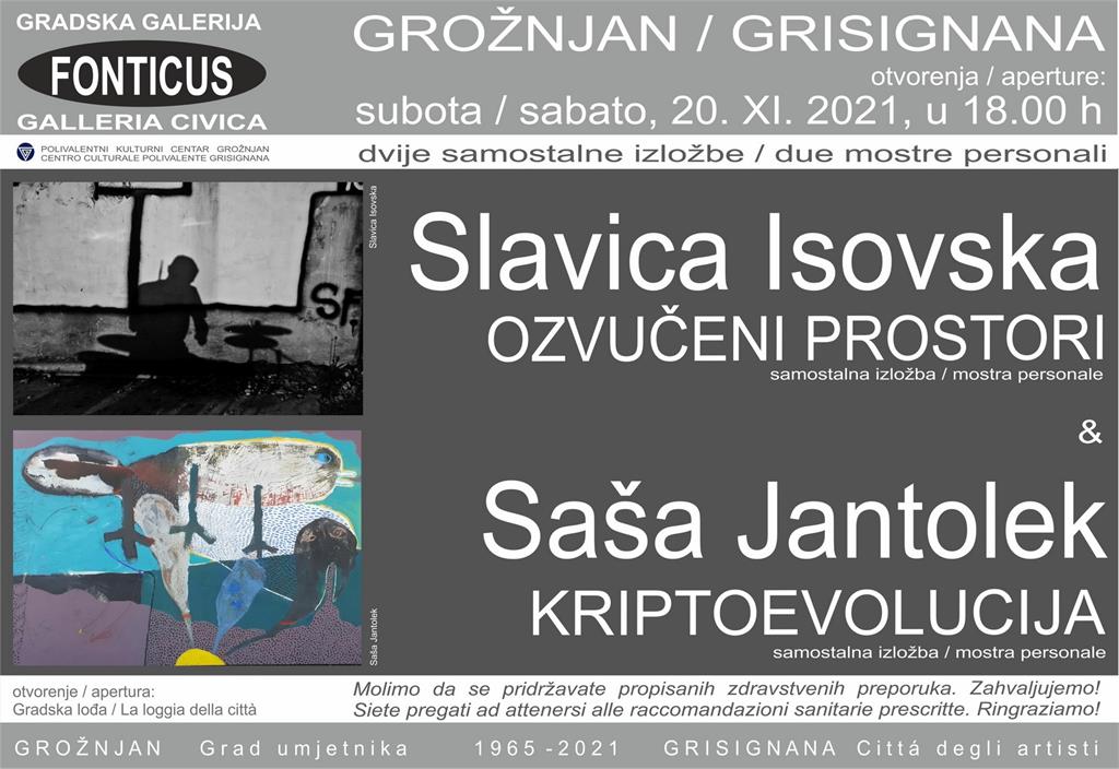 Dvije samostalne izložbe - Slavica Isovska: 'Ozvučeni prostori' & Saša Jantolek: 'Kriptoevolucija' bit će predstavljene 20. studenoga 2021. u Gradskoj galeriji Fonticus u Grožnjanu. Kustos izložbi je Eugen Borkovsky.