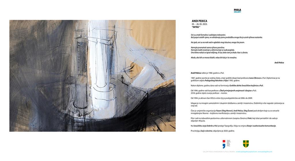 Izložba Andija Pekice pod nazivom 'Intro' otvara se u petak 5. svibnja u 19 sati u Galeriji Poola, Kandlerova 14, Pula. Izložba će se moći pogledati do 26. svibnja.