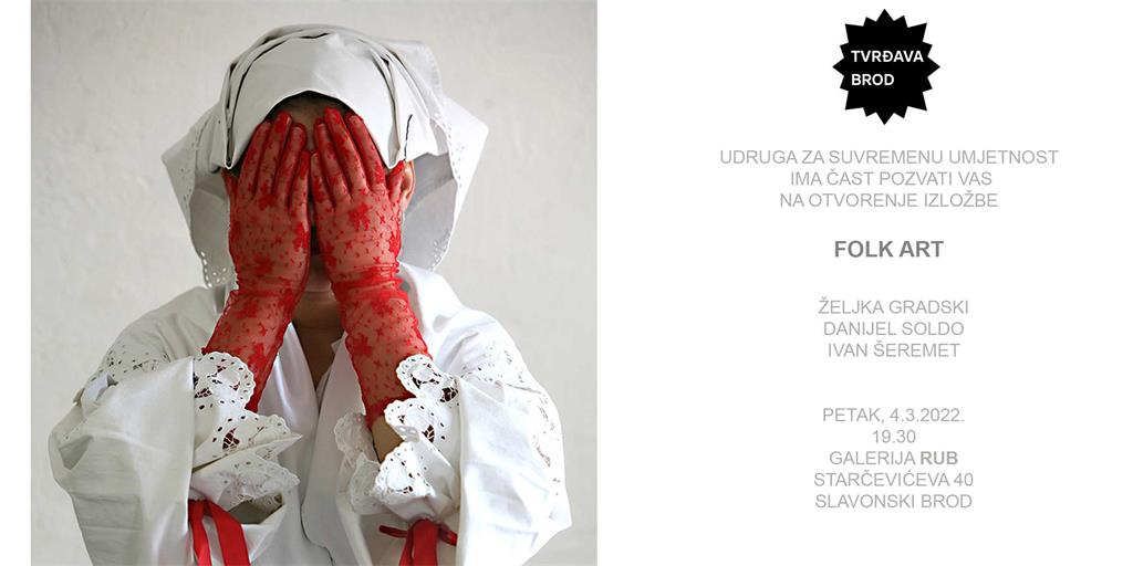 Tvrđava Brod, udruga za suvremenu umjetnost, najavljuje otvorenje izložbe 'Folk Art', 4. ožujka 2022. u 19.30 sati, u Galeriji RUB. Autori: Željka Gradski, Danijel Soldo, Ivan Šeremet.