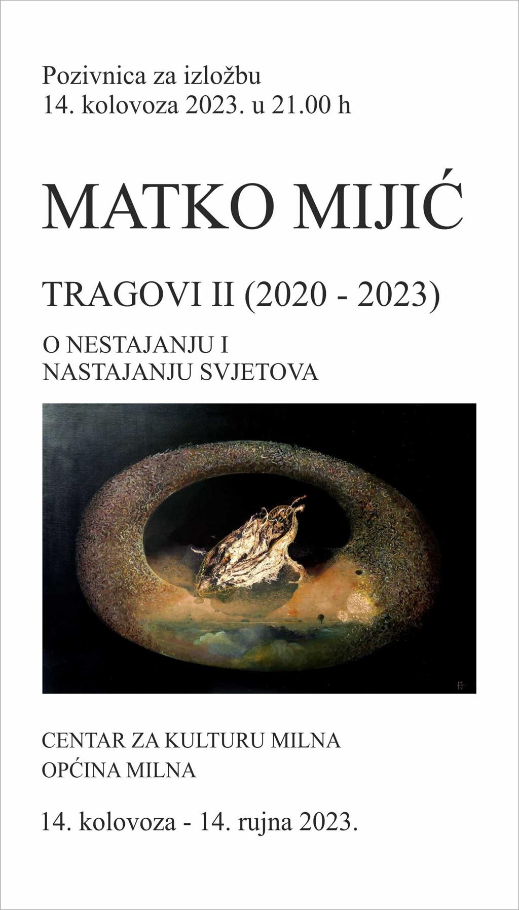 Izložba slika umjetnika Matka Mijića 'Tragovi II (2020. - 2023.) - o nestajanju i nastajanju svjetova' otvara se u ponedjeljak 14. kolovoza u 21 sat u Centru za kulturu u Milni na Braču. Radovi će se moći pogledati do 14. rujna.