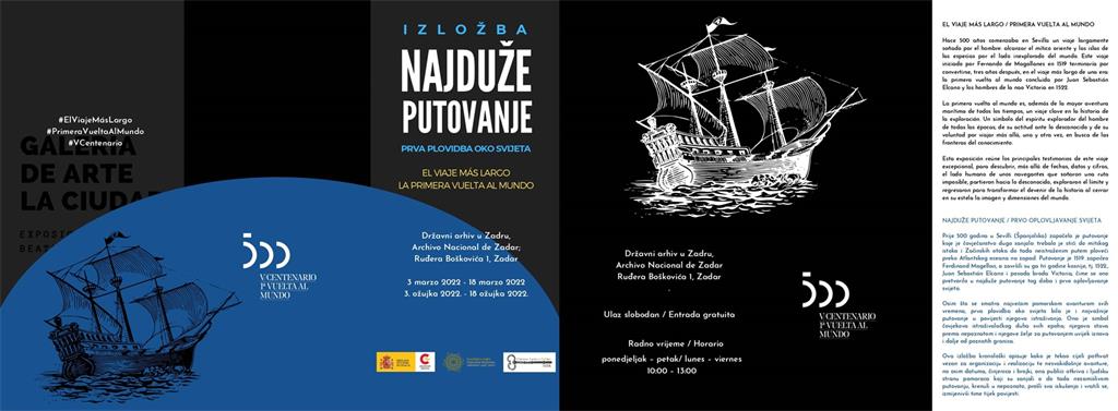 Državni arhiv u Zadru u suradnji sa Odjelom za hispanistiku i iberske studije Sveučilišta u Zadru i Veleposlanstvom Kraljevine Španjolske priređuje izložbu 'Najduže putovanje - Prva plovidba oko svijeta/ El viaje más largo - La primera vuelta al mundo', koja će biti predstavljena od 3. do 18. ožujka u Izložbenoj dvorani Arhiva.