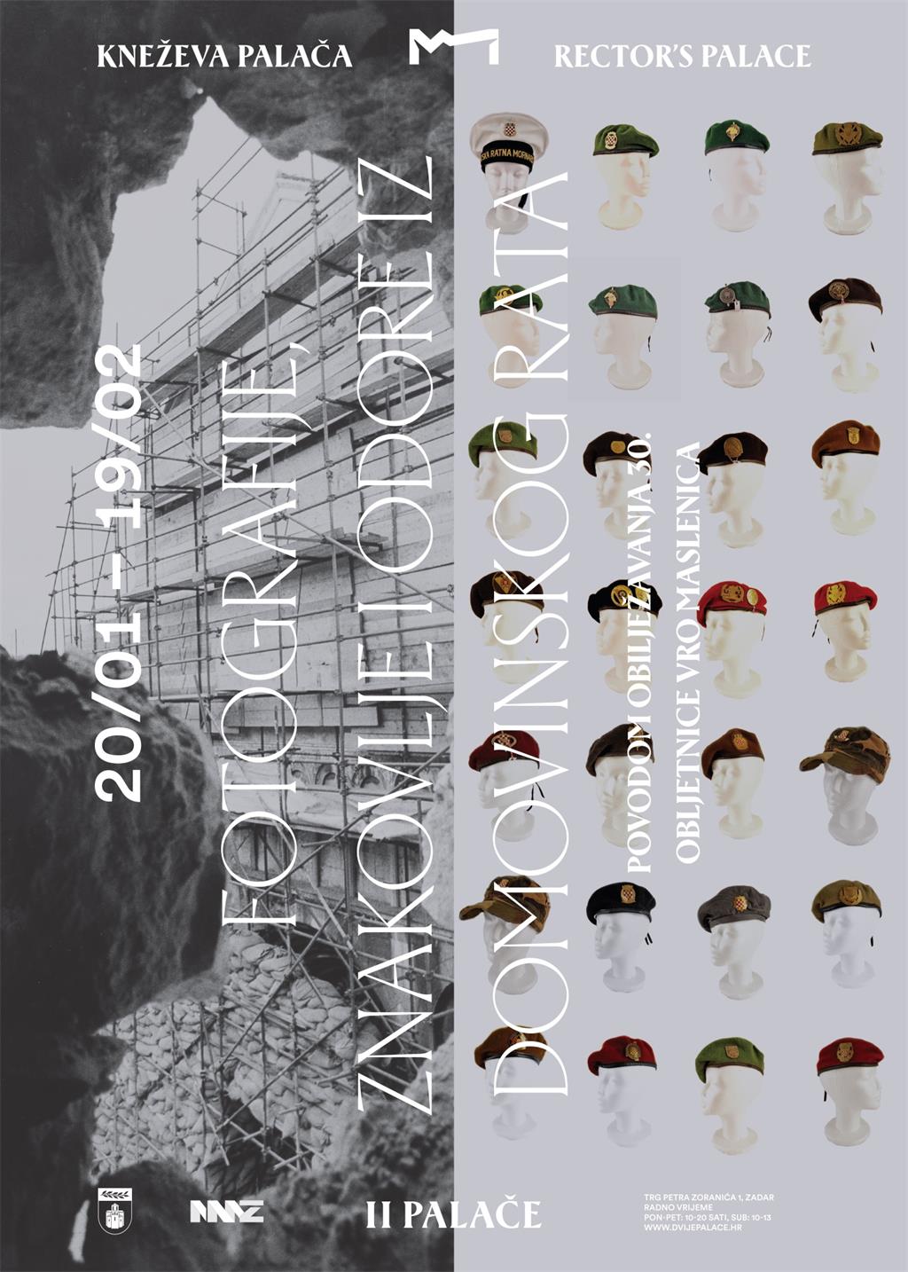 Narodni muzej Zadar priređuje izložbu 'Fotografije, znakovlje i odore iz Domovinskog rata' koja se otvara u petak, 20. siječnja s početkom u 12 sati u dvoranama u prizemlju Kneževe palače. Izložba je organizirana povodom obilježavanja 30. obljetnice VRO Maslenica.