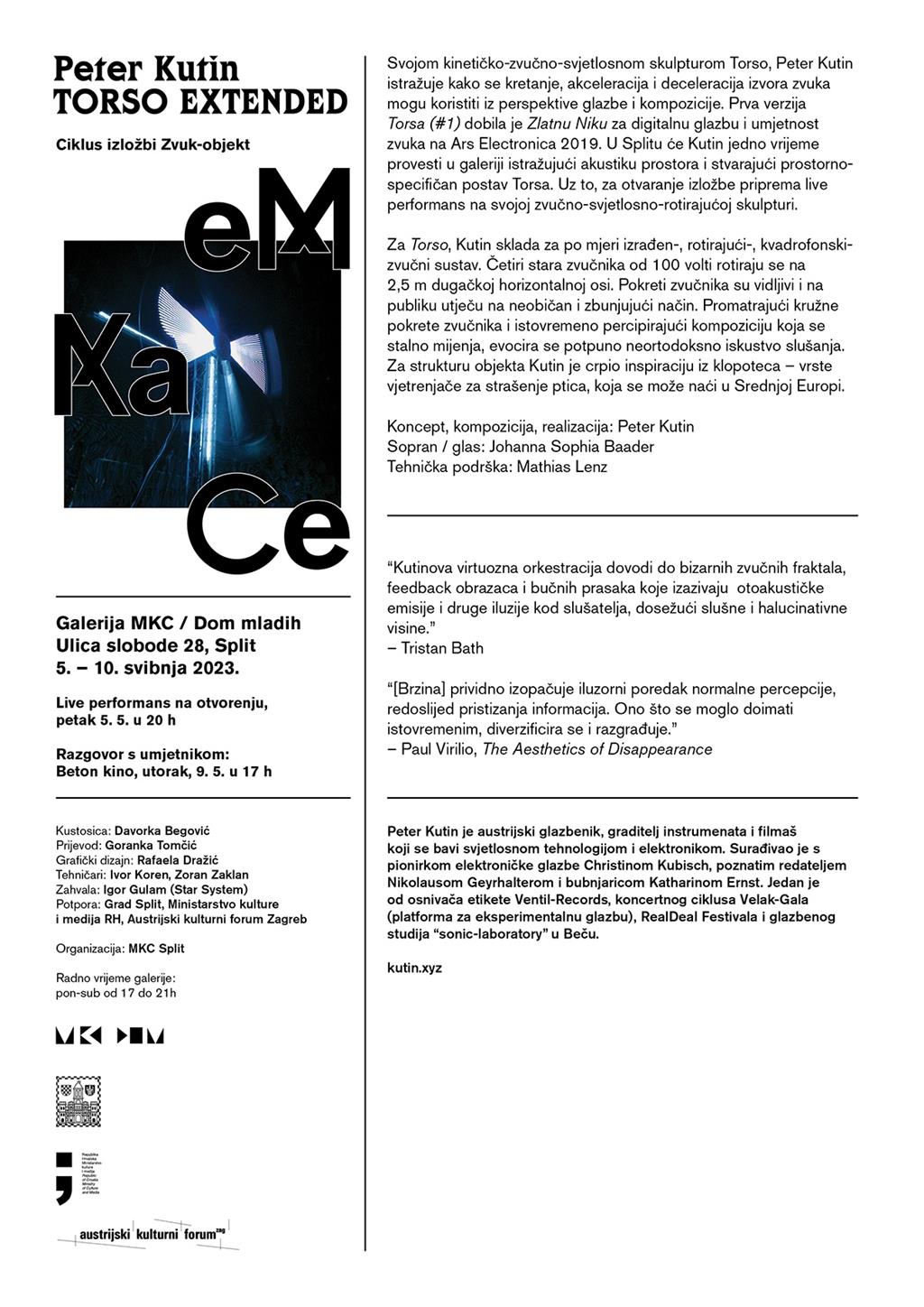 Izložba Petera Kutina 'Torso extended' otvara se u petak 5. svibnja u Galeriji MKC Split/ Dom mladih. Izložba je dio ciklusa Zvuk-objekt.