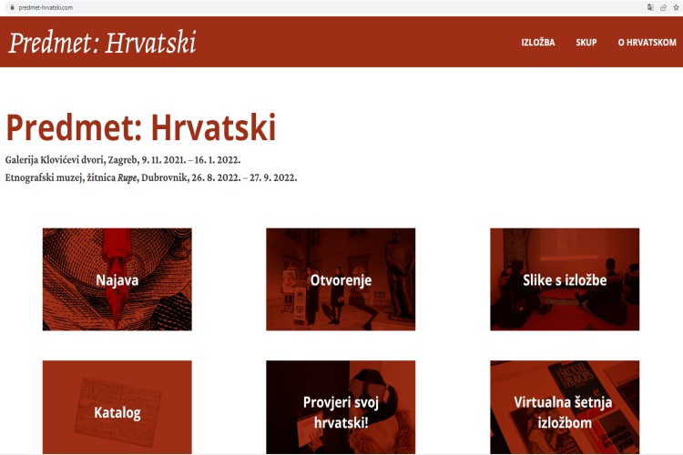 Izložba 'Predmet: Hrvatski' predstavlja se javnosti od 10. studenoga 2021. do 16. siječnja 2022. u Galeriji Klovićevi dvori u Zagrebu. Autorice izložbe su Ana Ćavar i Lahorka Plejić Poje.