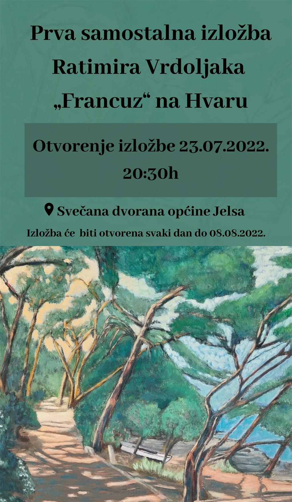 Prva samostalna izložba Ratimira Vrdoljaka 'Francuz' na Hvaru otvara se u Svečanoj dvorani općine Jelsa, u subotu 23. srpnja, s početkom u 20:30 sati. Izložba ostaje otvorena do 8. kolovoza.