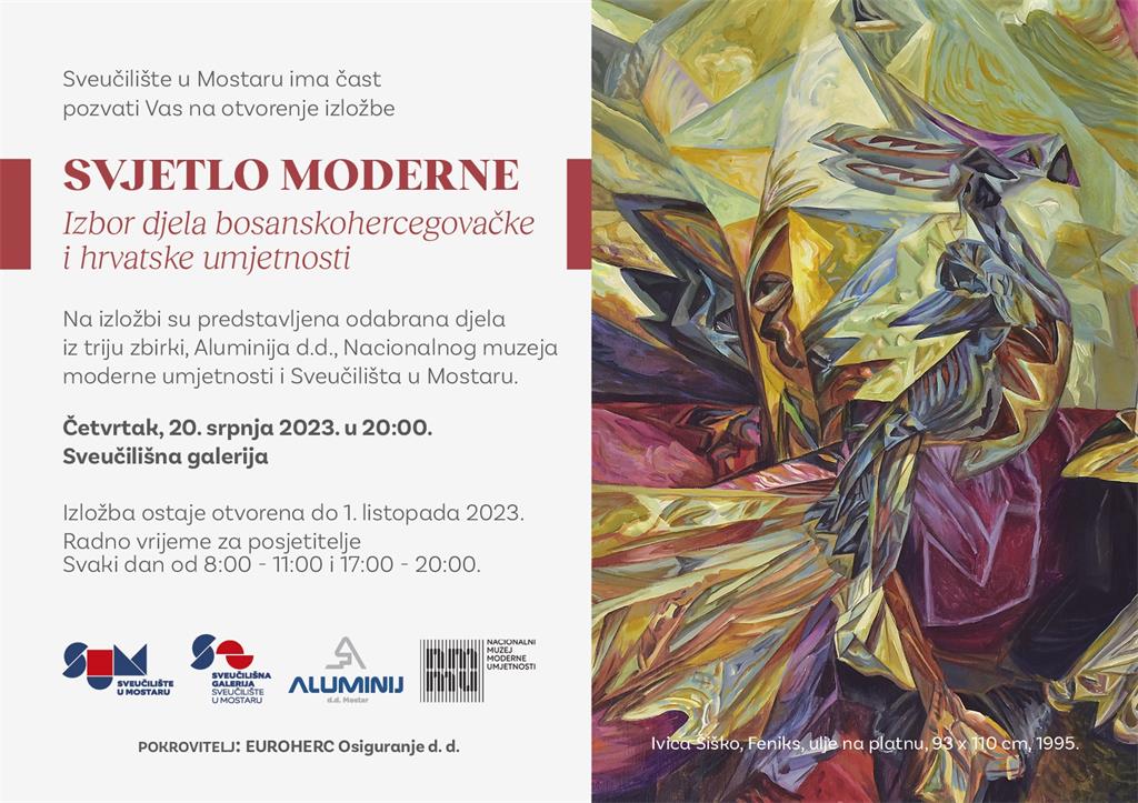 Izložba "Svjetlo moderne: Izbor djela bosanskohercegovačke i hrvatske umjetnosti" otvara se u četvrtak 20. srpnja 2023. u 20 sati, u Sveučilišnoj galeriji u Mostaru.