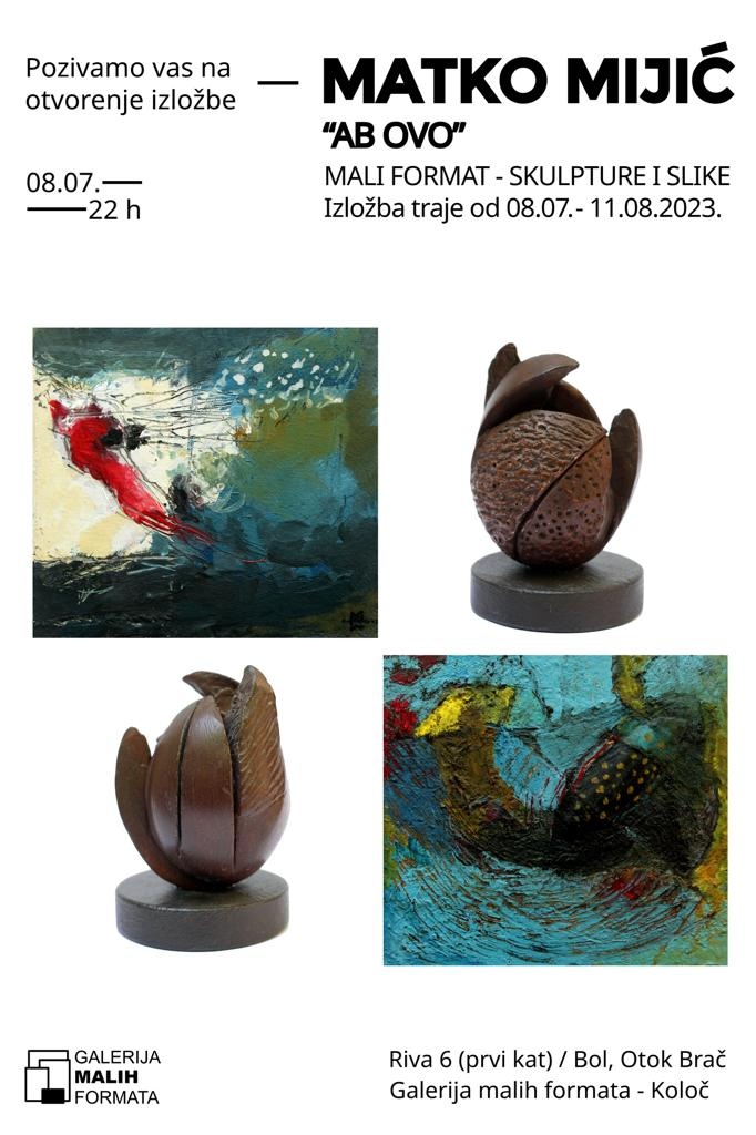 Izložba akademskog kipara Matka Mijića 'AB OVO' otvara se u subotu 8. srpnja u Galeriji malih formata – Koloč u Bolu na Braču, a moći će se razgledati do 11. kolovoza.