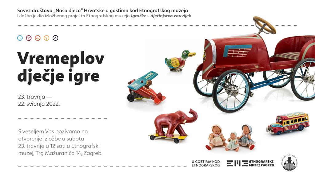 Gostujućom izložbom Saveza društava 'Naša djeca' Hrvatske 'Vremeplov dječje igre' koja se otvara u subotu, 23. travnja 2022. u 12 sati, završava veliki izložbeni projekt Etnografskog muzeja 'Igračke – djetinjstvo zauvijek'.