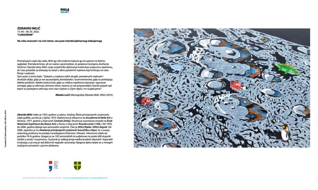 Izložba Zdravka Milića pod nazivom 'Lunadrom' - Na rubu znanosti i na ivici istine, van puta interdisciplinarnog inženjeringa, održava se od 15. travnja do 6. svibnja 2022. u Galeriji Poola.