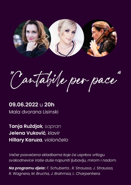 Koncert 'Cantabile per pace' u izvedbi Tanje Ruždjak, sopran, Jelene Vuković, klavir, i Hillary Karuza, violončelo, održat će se 9. lipnja u Maloj dvorani KD Vatroslava Lisinskog u Zagrebu, s početkom u 20 sati. Glazbena večer posvećena je najljepšim melodijama koje pozivaju na ljubav, nadu i mir.