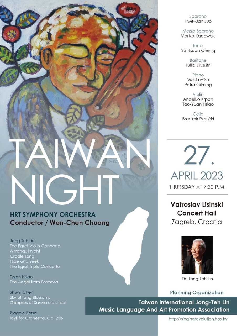 Koncert glazbe tajvanskih skladatelja 'Tajvanska noć' održat će se u četvrtak 27. travnja u velikoj dvorani Lisinski u Zagrebu, s početkom u 19.30 sati.