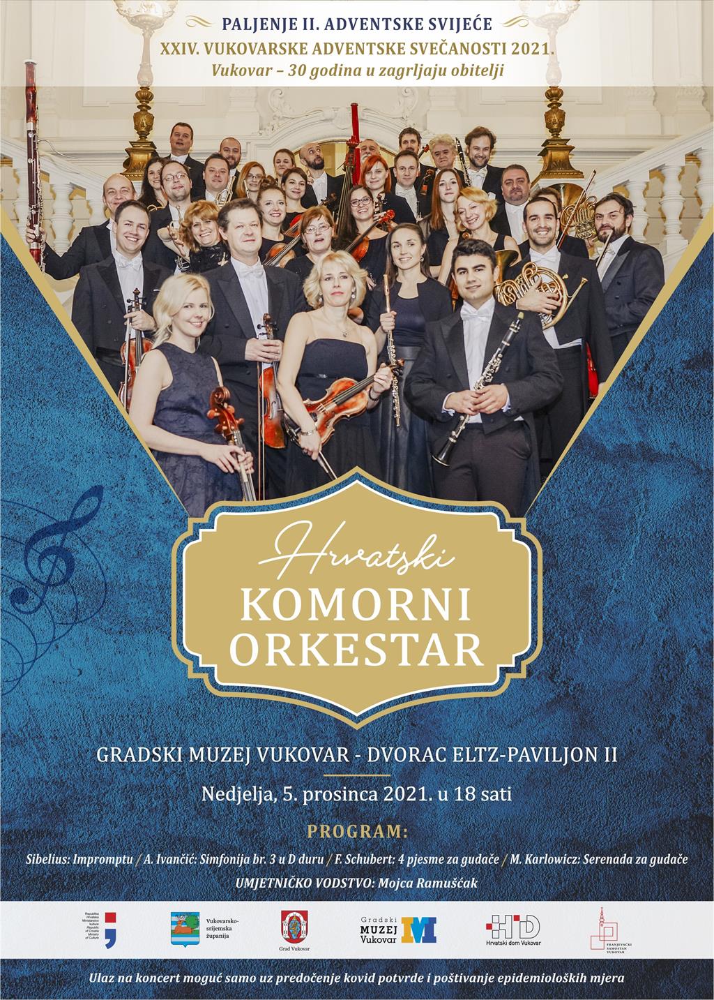 Hrvatski komorni orkestar nastupit će 5. prosinca 2021. u Gradskom muzeju Vukovar - Dvorcu Eltz, u okviru programa Vukovarskih adventskih svečanosti.
