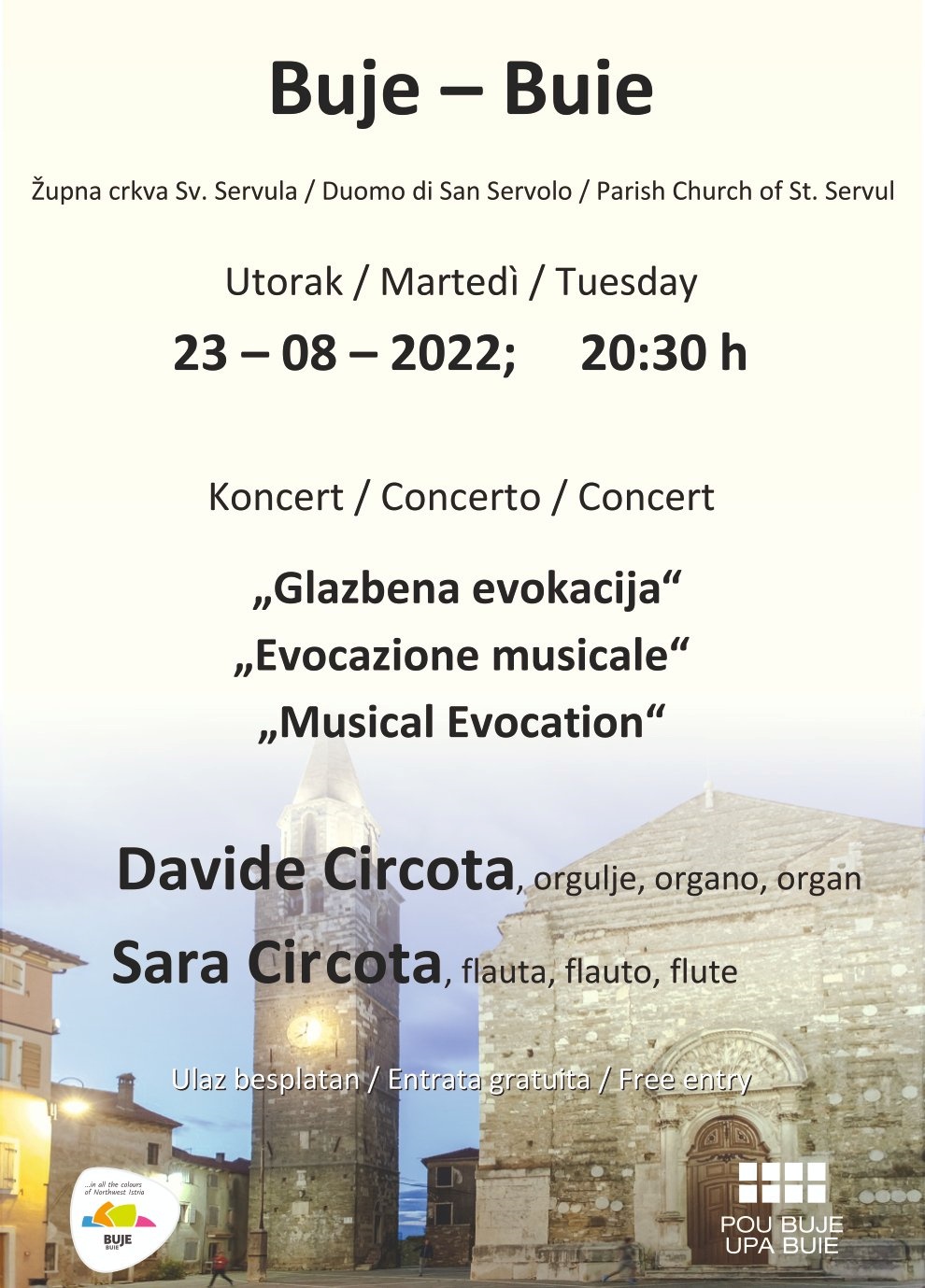 Na koncertu u župnoj crkvi sv. Servula u Bujama, u utorak, 23. kolovoza u 20:30 sati, nastupit će Davide Circota, orgulje, i Sara Circota, flauta. Ulaz je slobodan.