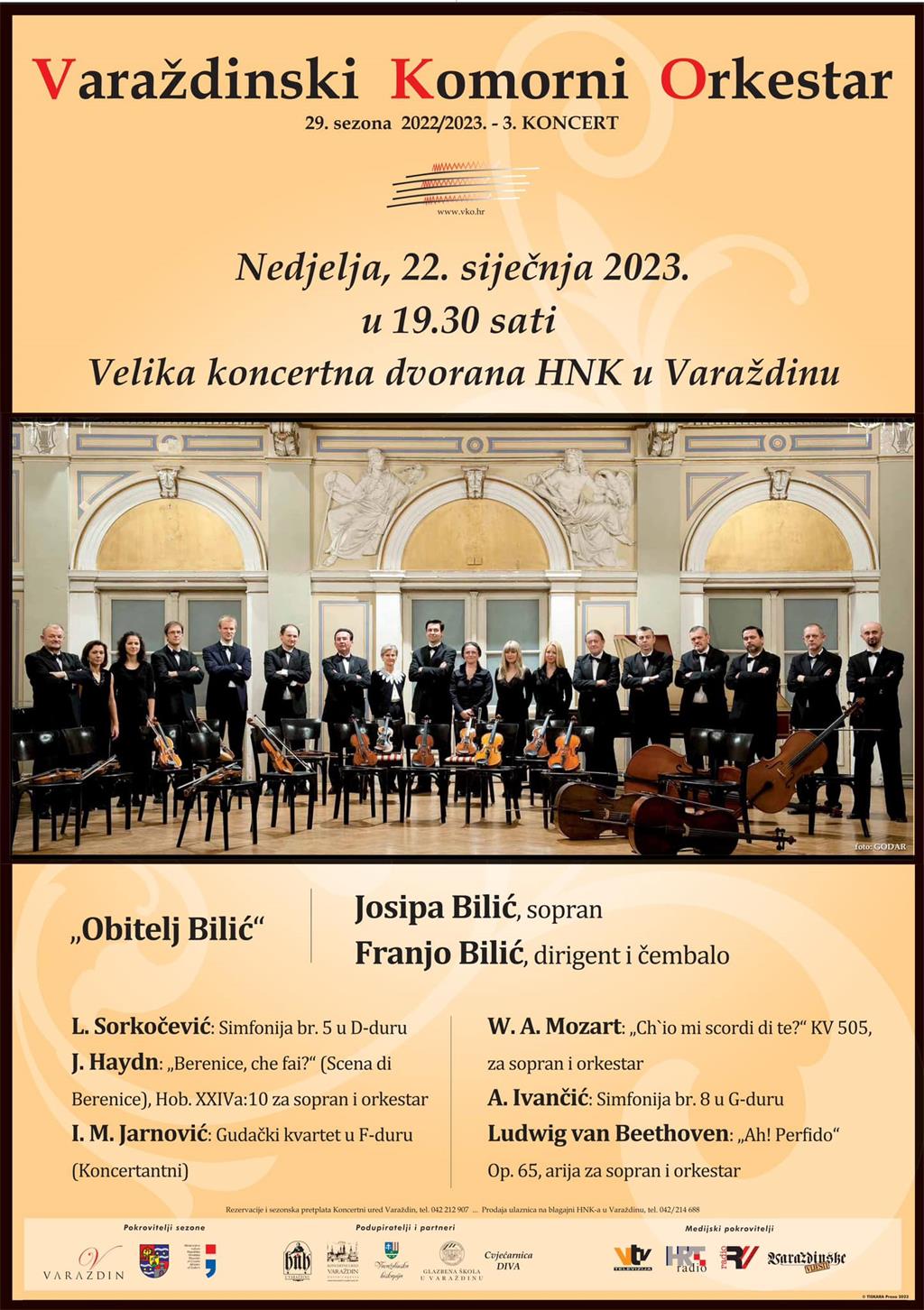 Varaždinski komorni orkestar i njihovi gosti - Josipa i Franjo Bilić nastupit će 22. siječnja u Velikoj koncertnoj dvorani HNK-a u Varaždinu. Početak koncerta je u 19.30 sati.
