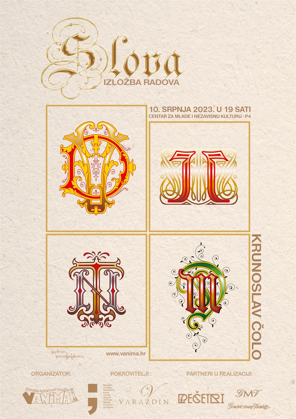 U ponedjeljak 10.srpnja u Centru za mlade i nezavisnu kulturu – P4 otvara se izložba kaligrafija „Slova“ čiji je autor varaždinski umjetnik Krunoslav Čolo.