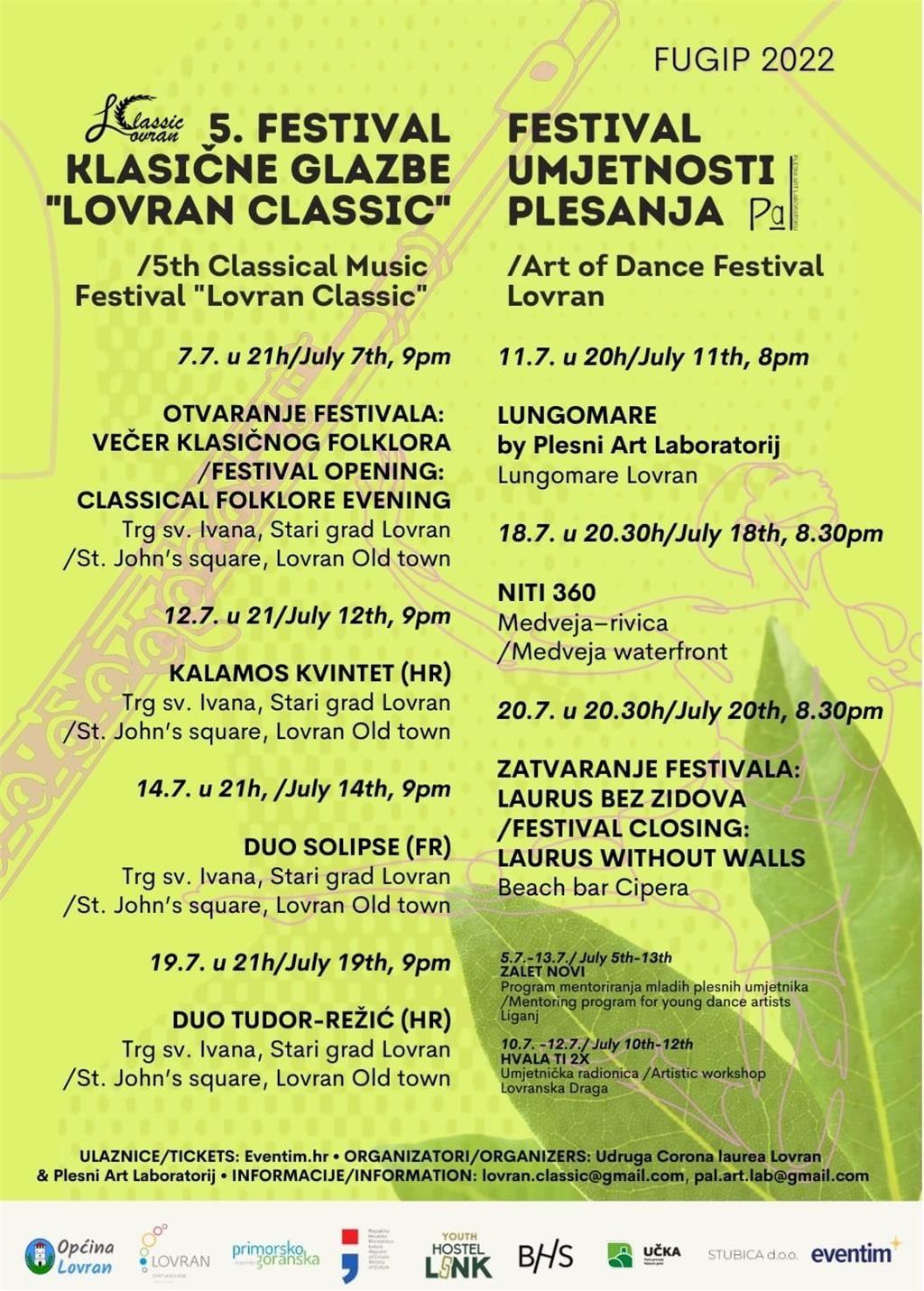 U Lovranu će se od 7. do 20. srpnja 2022. godine održavati jedinstveno događanje 'Festival umjetnosti, glazbe i plesanja - FUGiP 2022'. Čine ga 5. Festival klasične glazbe 'Lovran Classic' i Festival umjetnosti plesanja, u organizaciji Udruge Corona Laurea Lovran i Plesnog Art Laboratorija, koji su ove godine po prvi puta udružili svoje snage.