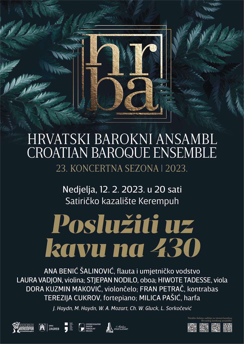 Hrvatski barokni ansambl najavljuje koncert pod nazivom 'Poslužiti uz kavu na 430' koji će se održati u Satiričkom kazalištu Kerempuh u Zagrebu, 12. veljače s početkom u 20 sati.