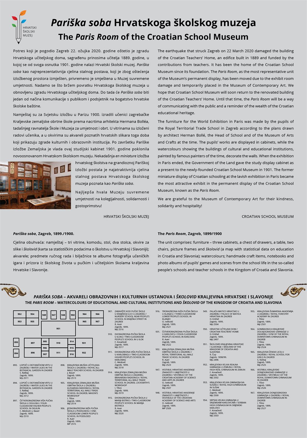 Najreprezentativnija izložbena cjelina Hrvatskog školskog muzeja – Pariška soba – svoj je privremeni smještaj našla u Muzeju suvremene umjetnosti u Zagrebu gdje će se do daljnjega moći besplatno razgledati.