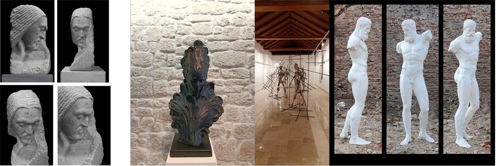 (Kolaž od 4 fotografije portreta: rad Frana Marka Vlahinića; fotografija crnog portreta ispred kamenog zida: rad Mirne Savić; fotografija šetaća u prostoru galerija: rad Lucije Jelić; fotografija figure bez ruku: rad Lucijana Kujundžića).