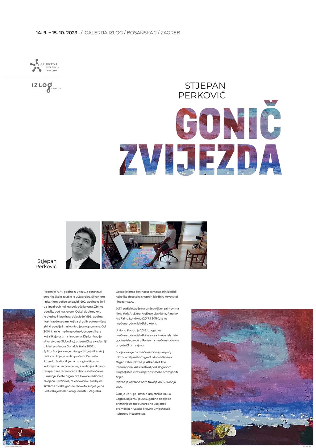 Izložba likovnog umjetnika Stjepana Perkovića 'Gonič zvijezda' otvara se u četvrtak 14. rujna u 18 sati u Galeriji Izlog u Zagrebu.