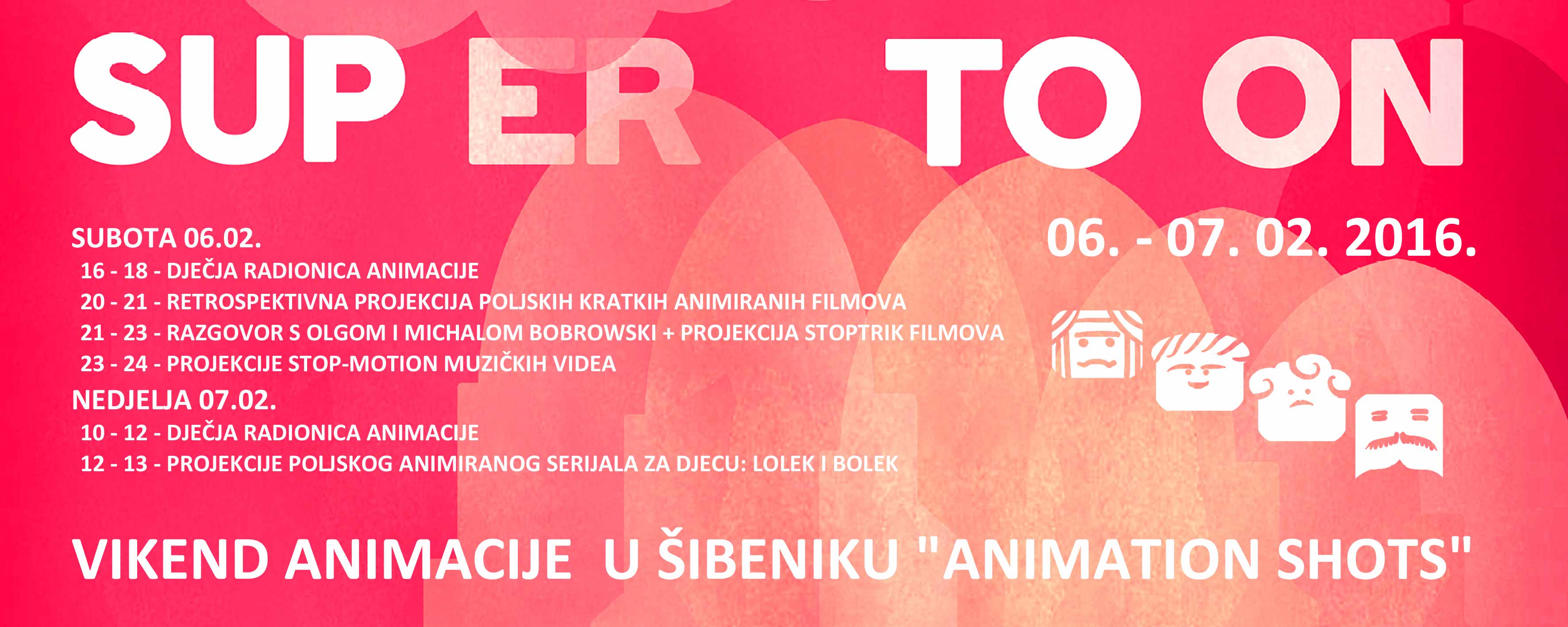 U Šibeniku će se u subotu i nedjelju, 6. i 7. veljače, održati prvi vikend animacije Animation Shots, u organizaciji Supertoon - međunarodnog festivala animacije, a kao uvod u šesto izdanje festivala koje će se održati u srpnju 2016. godine. Projekcije se održavaju u Studiju galerije Sv. Krševana - Galerija Matija (Petra Nakića bb, Šibenik), a ulaz na sva događanja je besplatan!