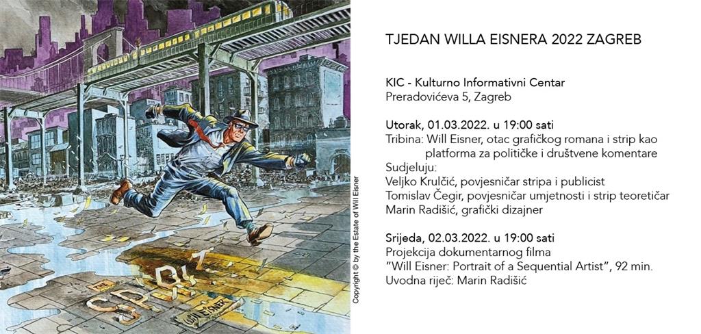 Manifestacija 'Will Eisner Week 2022' posvećena liku i djelu američkog strip autora i pisca - Willa Eisnera, koja se već dvanaest godina zaredom održava diljem svijeta, ove će se godine, od 1. do 7. ožujka 2022., po prvi put održati i u Zagrebu. Uz odavanje počasti ostavštini Willa Eisnera, ova manifestacija posvećena je promicanju grafičkog romana, slobode govora i sekvencijalne umjetnosti.