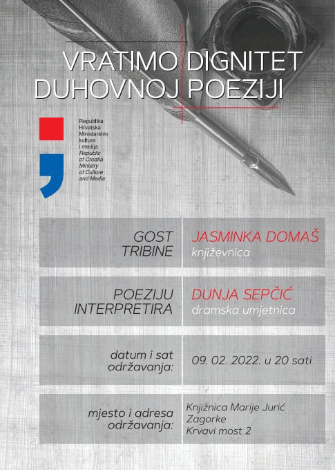 Sljedeća tribina 'Vratimo dignitet duhovnoj poeziji' održat će se 9. veljače 2022. u 20 sati, u Knjižnici Marije Jurić Zagorke u Zagrebu. Gošća tribine je Jasminka Domaš, a poeziju interpretira Dunja Sepčić.