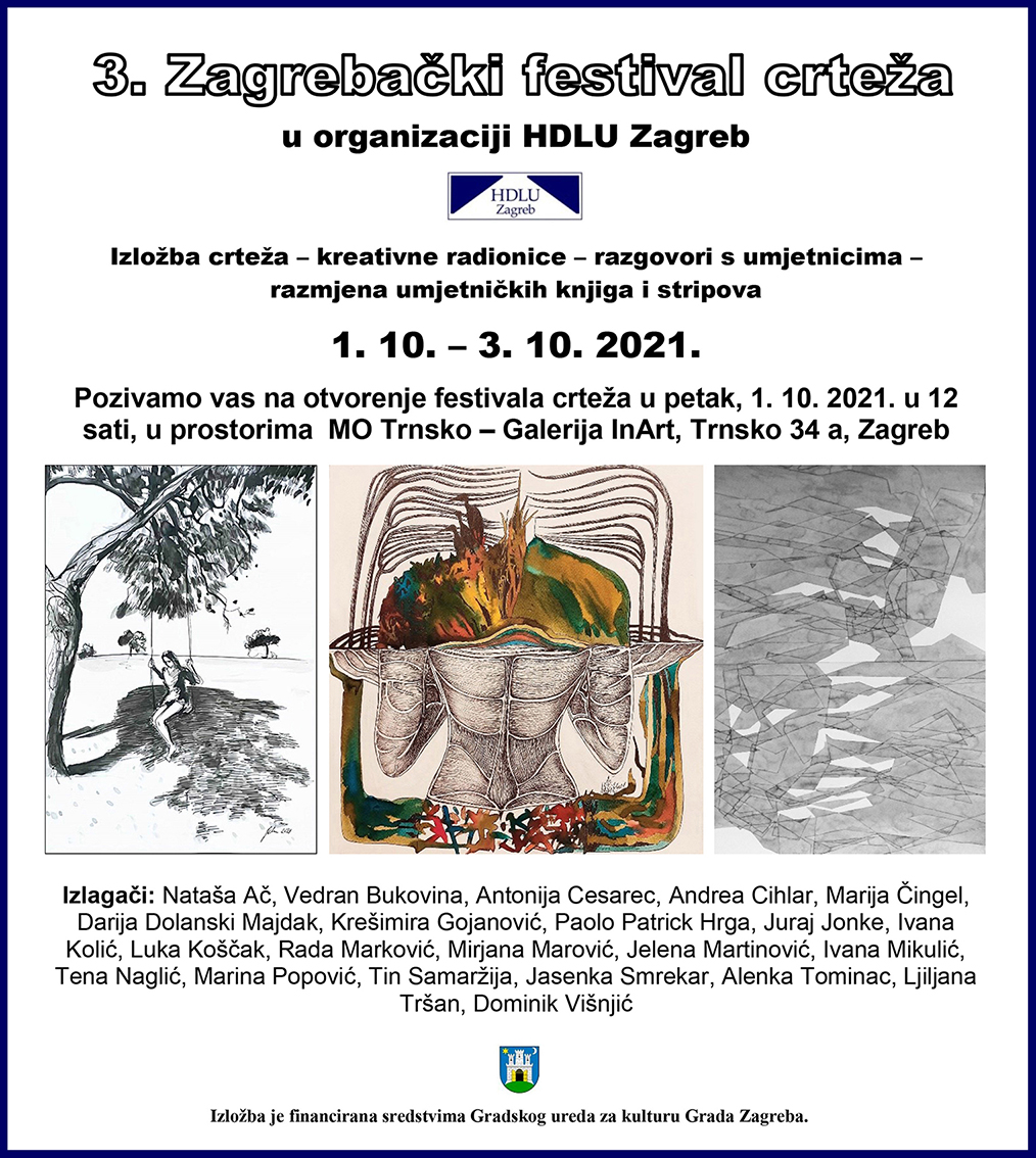 '3. Zagrebački festival crteža' održat će se od 1. do 3. listopada 2021. u InArt galeriji u Zagrebu (MO Trnsko), u organizaciji HDLU-a Zagreb. Tema ovogodišnjeg festivala je - avantura.